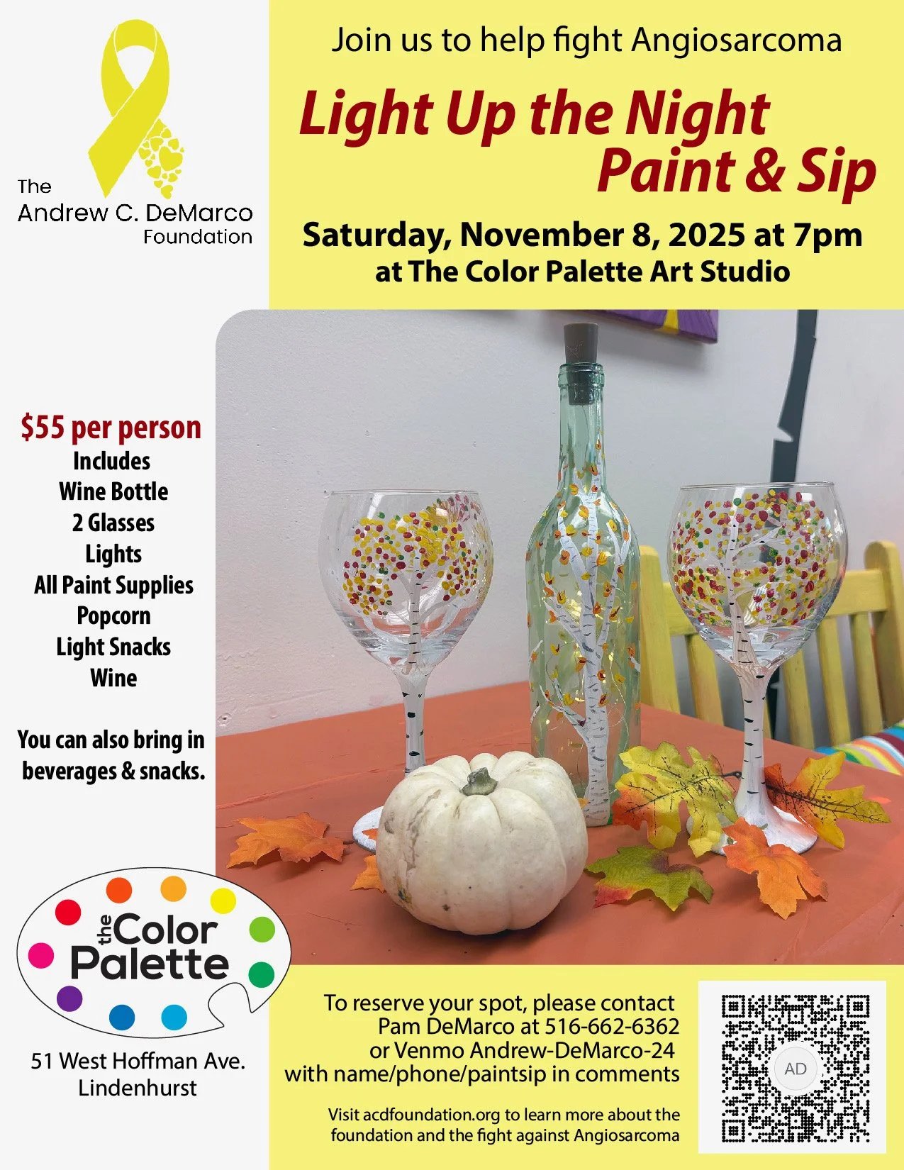 Join us Saturday, November 8, 2025 at 7pm for our Light Up the Night Paint and Sip fundraiser at The Color Palette Art Studio in Lindenhurst, NY!